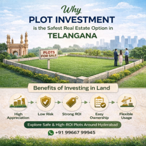 Investors are now seeking plot investments instead of buying flats or commercial properties in Telangana. This is because buying a plot is a lower risk option that appreciates over time and gives long term security. Because of rapid development in and around Hyderabad investing in land has become a safe way to build wealth. Plot investment is arguably the safest option in Telangana for real estate investment.